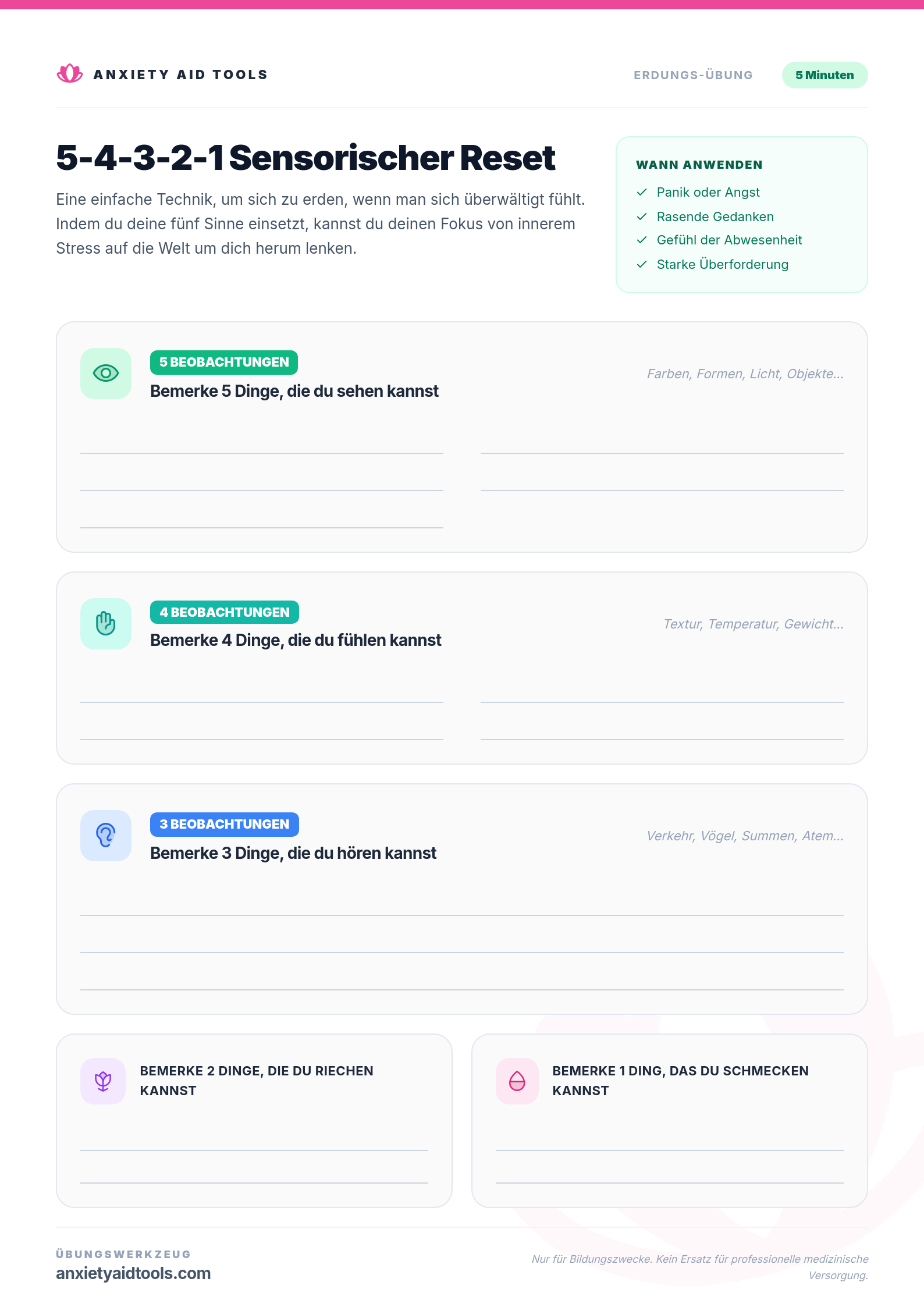 Die Countdown-Struktur (5-4-3-2-1) bietet ein kognitives Gerüst, das Ihrem Geist eine konkrete Aufgabe gibt, verhindert, dass er in Sorgen spiralt, und verankert Sie gleichzeitig in Ihrer physischen Umgebung und im gegenwärtigen Moment.