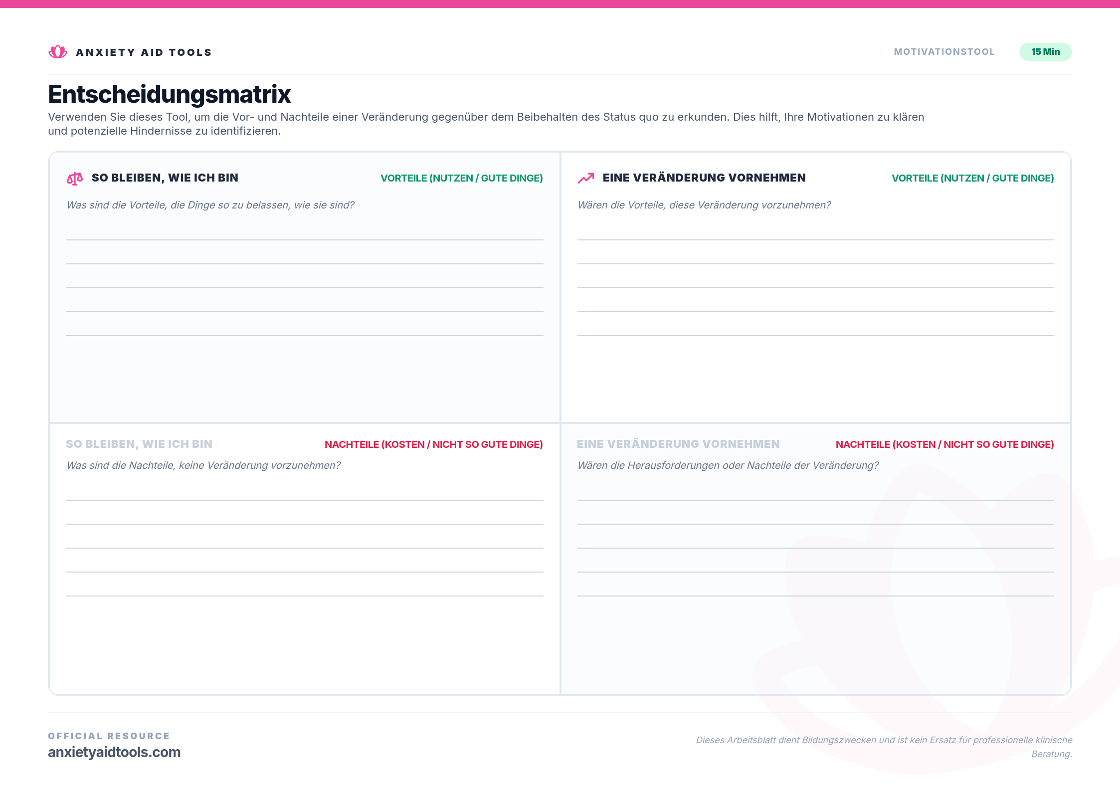 Die Entscheidungsmatrix ist ein leistungsfähiges Werkzeug aus der Motivierenden Gesprächsführung (MI), das Ihnen helfen soll, Ambivalenz zu navigieren. Wann immer wir eine wesentliche Veränderung in Betracht ziehen - sei es das Starten einer neuen Gewohnheit, das Beenden einer Beziehung oder das Ändern eines Verhaltens - fühlen wir uns natürlich in zwei Richtungen gezogen. Dieses Arbeitsblatt hilft Ihnen, diesen inneren Konflikt zu externalisieren.