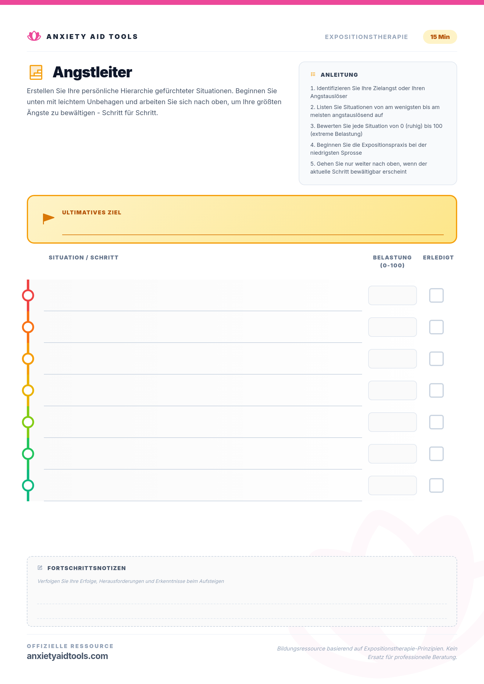 Dieses Arbeitsblatt hilft Ihnen, einen personalisierten Fahrplan für schrittweise Exposition zu erstellen. Jede 'Sprosse' repräsentiert eine bestimmte Situation oder Herausforderung, bewertet danach, wie viel Stress sie verursacht (0-100). Die farbcodierte Leiter stellt visuell Ihre Reise von Komfort (grün) zu Ihrem ultimativen Ziel (rot) dar.