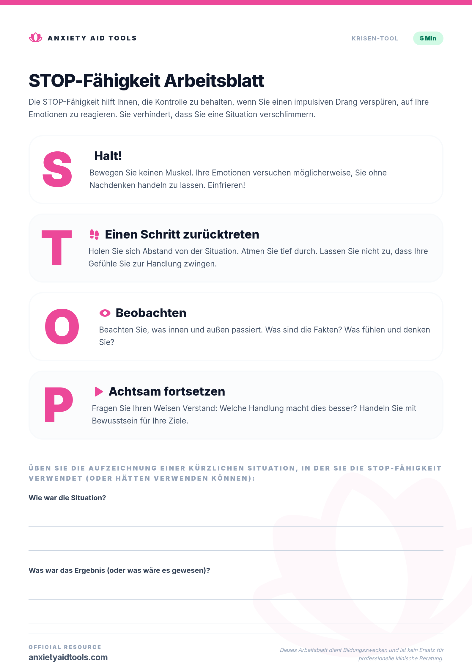 Die STOP-Fähigkeit ist ein grundlegendes Toleranz-Skill, der darauf ausgelegt ist, eine 'Lücke' zwischen einem Auslöser und Ihrer Reaktion zu schaffen. In Momenten hoher Emotionen ist unser natürlicher Instinkt, sofort zu reagieren, oft auf Weisen, die die Situation verschlimmern (z.B. einen gemeinen Text senden, einen Job kündigen oder sich zurückziehen).