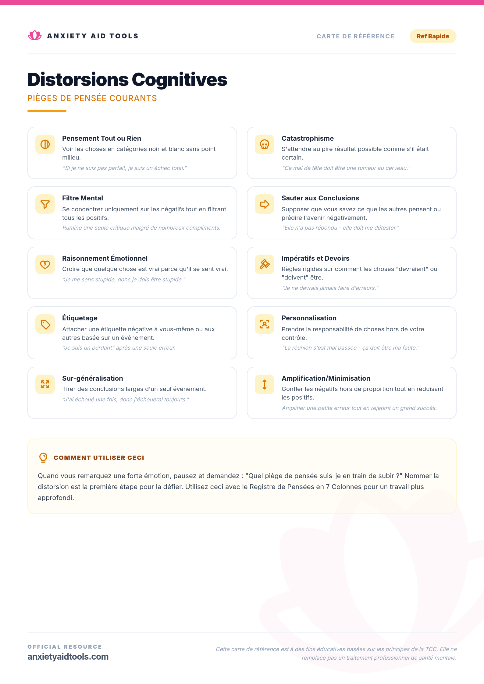 Pour obtenir les meilleurs résultats, utilisez cette carte de référence avec votre Registre de Pensées en 7 Colonnes ou d'autres outils de restructuration cognitive. Quand vous attrapez une pensée automatique, parcourez cette liste pour voir dans quel "piège de pensée" elle tombe. En nommant la distorsion spécifique, vous gagnez une distance psychologique immédiate de la pensée, la rendant beaucoup plus facile à défier avec des preuves équilibrées. La pratique constante aide à recâbler votre cerveau pour adopter naturellement des perspectives plus flexibles et réalistes avec le temps.