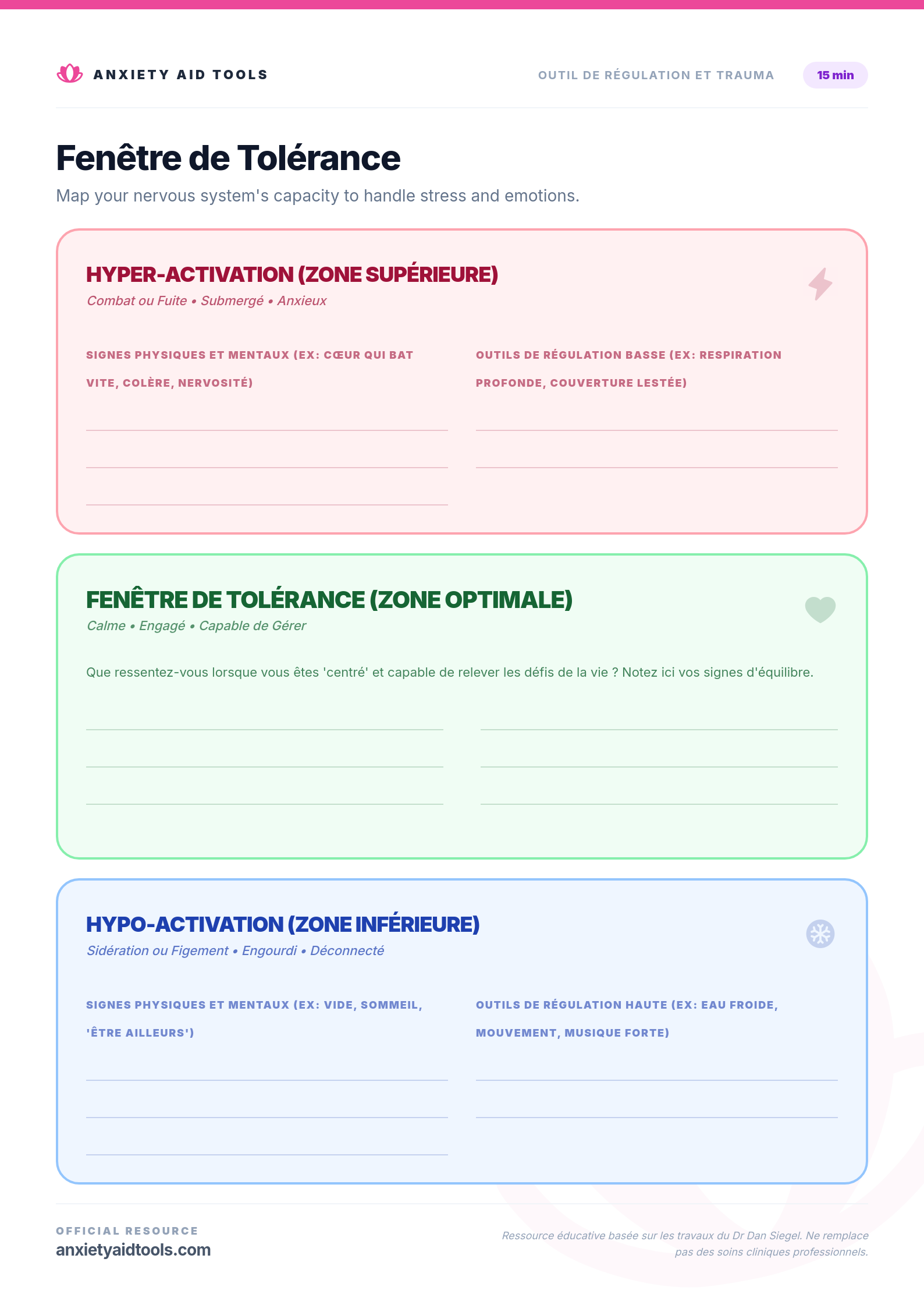 En identifiant vos déclencheurs et vos symptômes personnels, vous pouvez repérer la dysrégulation précocement. Notre fiche Fenêtre de Tolérance offre un espace dédié pour lister les outils spécifiques qui vous aident à revenir à votre centre, que vous ayez besoin de "réguler vers le bas" l'anxiété ou de "réguler vers le haut" en cas d'engourdissement.