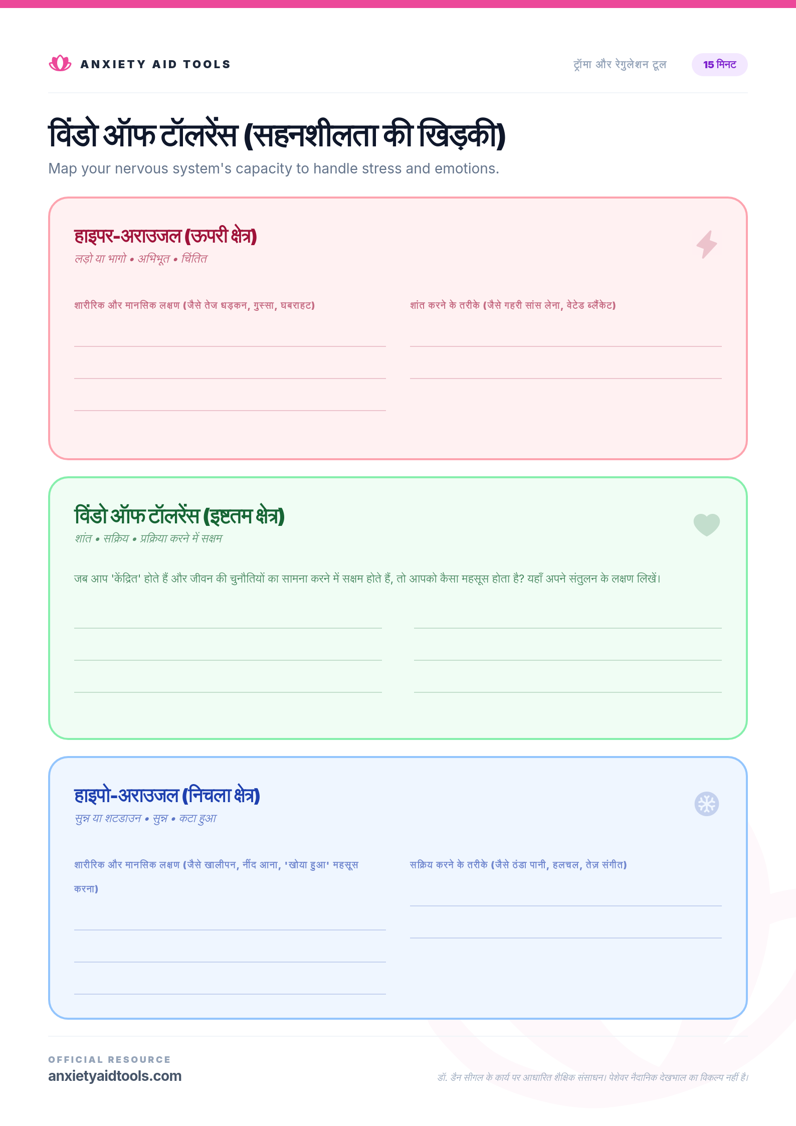 अपने व्यक्तिगत ट्रिगर्स और लक्षणों की पहचान करके, आप असंतुलन को जल्दी पकड़ सकते हैं। हमारी विंडो ऑफ टॉलरेंस कार्यपत्रक उन विशिष्ट उपकरणों को सूचीबद्ध करने के लिए एक समर्पित स्थान प्रदान करती है जो आपको अपने केंद्र में लौटने में मदद करते हैं - चाहे आपको चिंता को कम करने की आवश्यकता हो या सुन्नता से बाहर निकलने की।