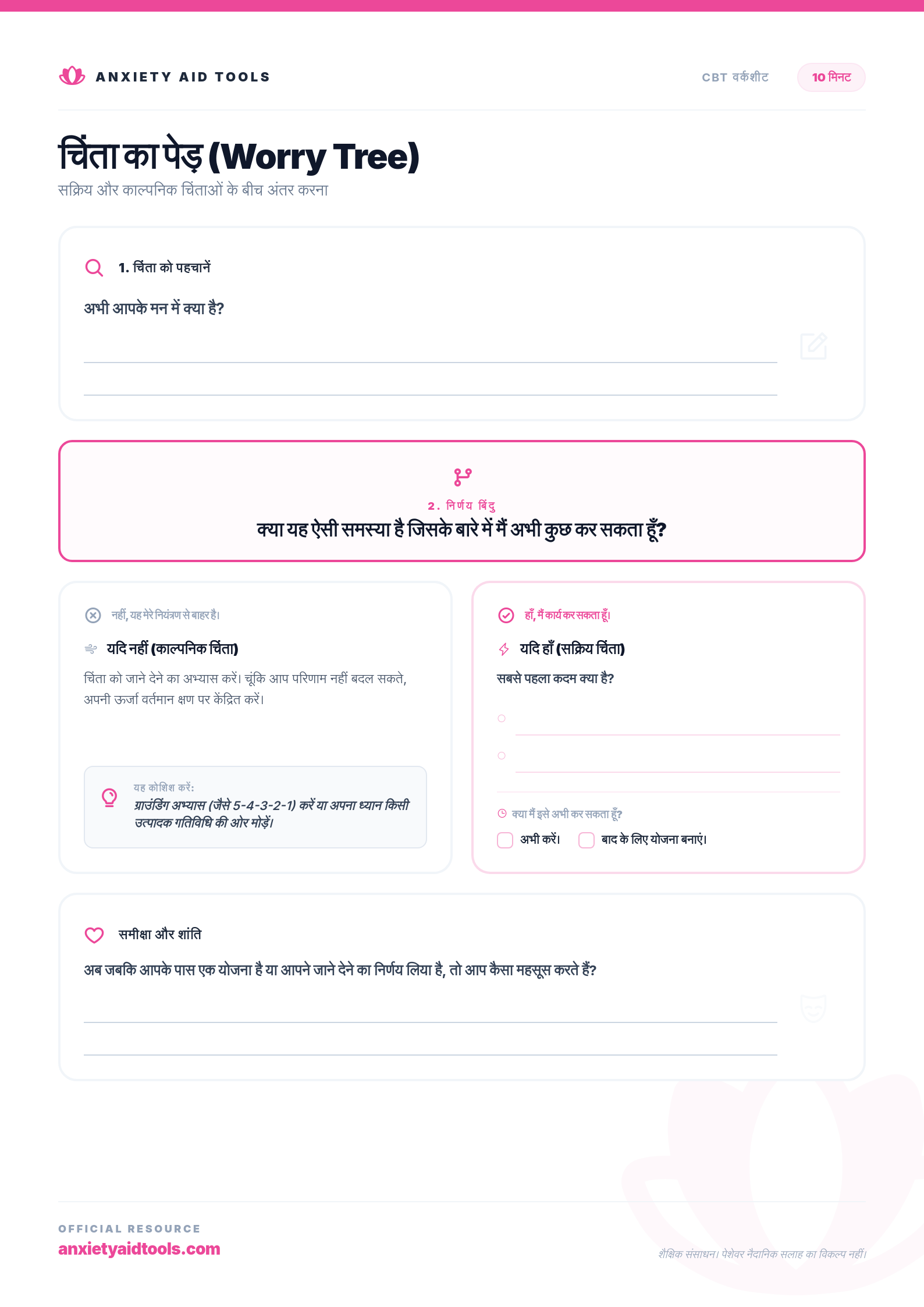 यह वर्कशीट आपको एक तार्किक निर्णय लेने की प्रक्रिया के माध्यम से निर्देशित करती है। खुद से एक सरल प्रश्न पूछकर—'क्या यह ऐसी समस्या है जिसके बारे में मैं कुछ कर सकता हूँ?'—आप अपनी चिंताओं को वर्गीकृत कर सकते हैं और सही मनोवैज्ञानिक रणनीति लागू कर सकते हैं। यदि उत्तर हाँ है, तो हम सक्रिय योजना की ओर बढ़ते हैं। यदि यह नहीं है, तो हम फिर से ध्यान केंद्रित करने और जाने देने की कला का अभ्यास करते हैं।