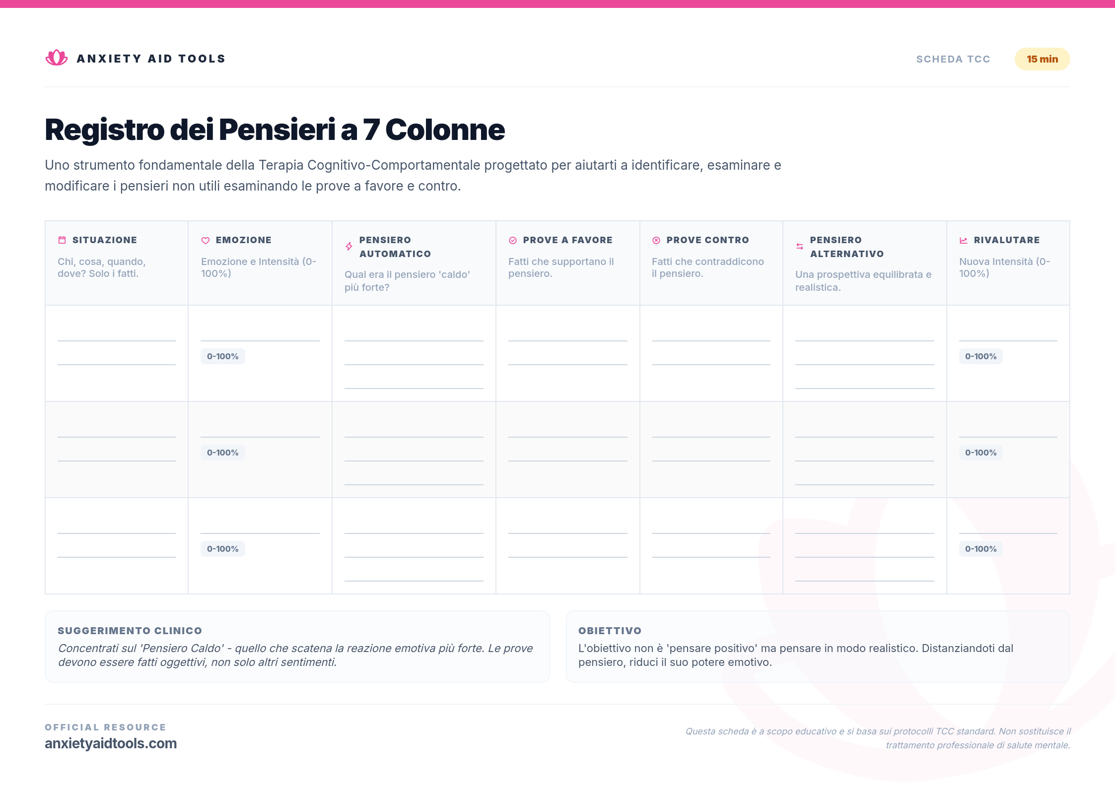 Il Registro dei Pensieri a 7 Colonne è il gold standard della Terapia Cognitivo-Comportamentale (TCC). È un modo strutturato per valutare i pensieri che scatenano disagio emotivo. Rallentando e scrivendo le prove a favore e contro un pensiero, puoi passare dal ragionamento emotivo alla realtà oggettiva.
