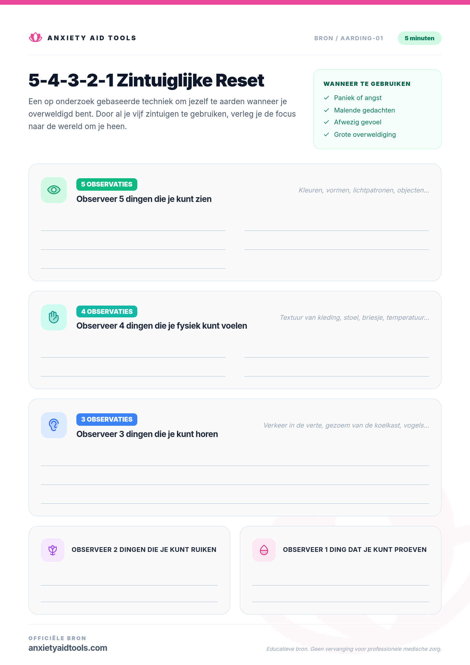 Een papieren versie van deze oefening. Dingen met de hand opschrijven kan je helpen te vertragen en aanwezig te blijven wanneer je je overweldigd voelt.
