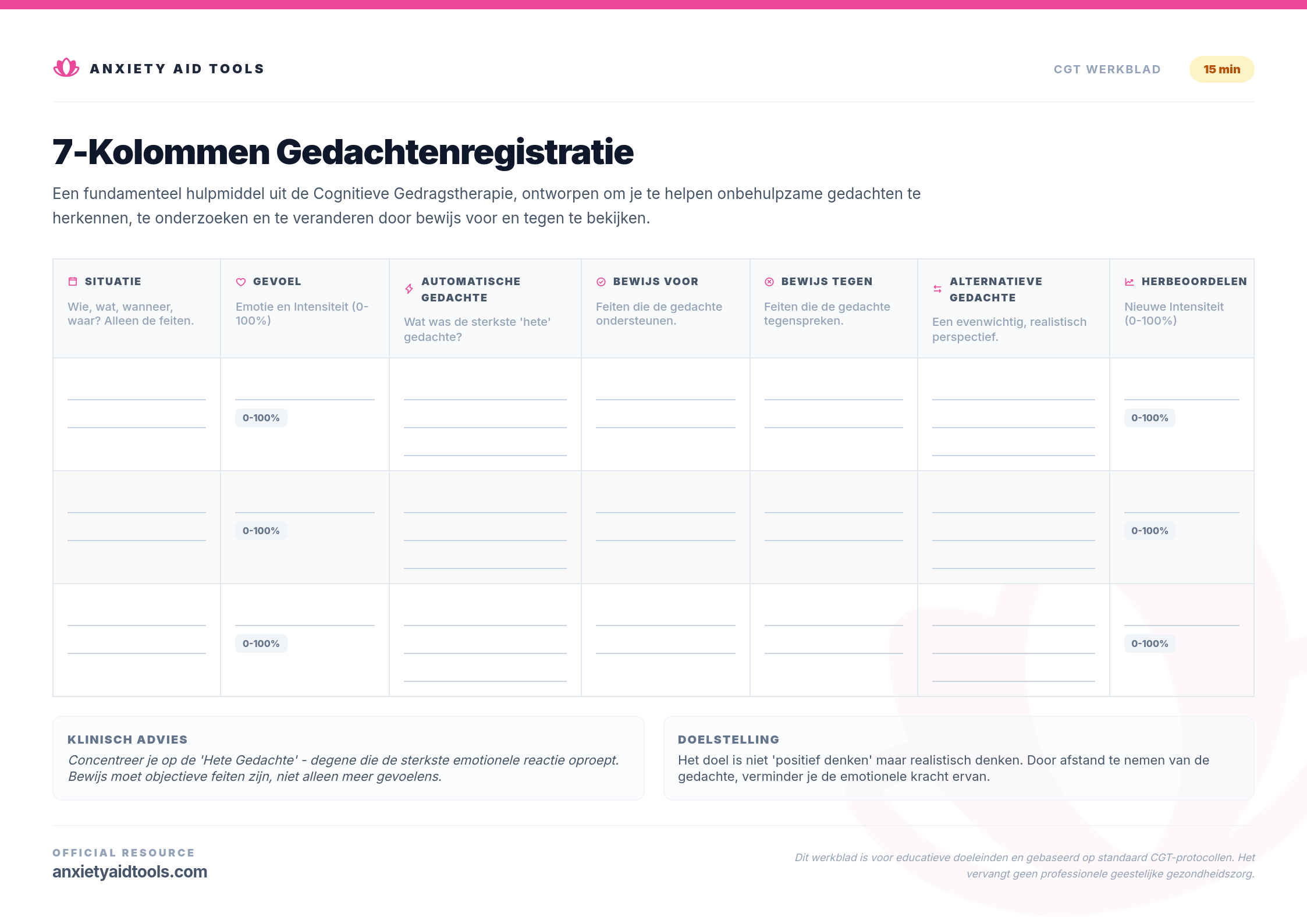De 7-Kolommen Gedachtenregistratie is de gouden standaard van Cognitieve Gedragstherapie (CGT). Het is een gestructureerde manier om gedachten te evalueren die emotionele stress veroorzaken. Door langzamer te gaan en het bewijs voor en tegen een gedachte op te schrijven, kun je van emotioneel redeneren naar objectieve realiteit gaan.