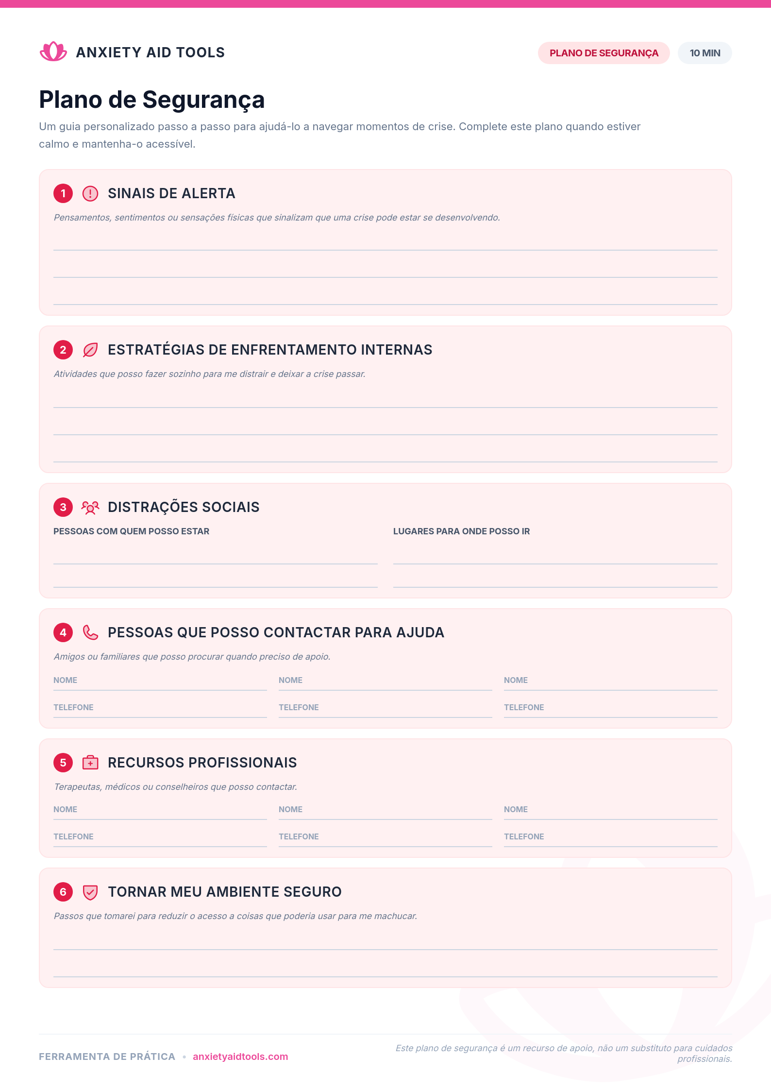 Esta folha de atividades guia você através de seis passos essenciais: reconhecer seus sinais de alerta pessoais, identificar estratégias de enfrentamento internas, listar distrações sociais, anotar pessoas que você pode contatar para ajuda, documentar recursos profissionais e planejar maneiras de tornar seu ambiente mais seguro.