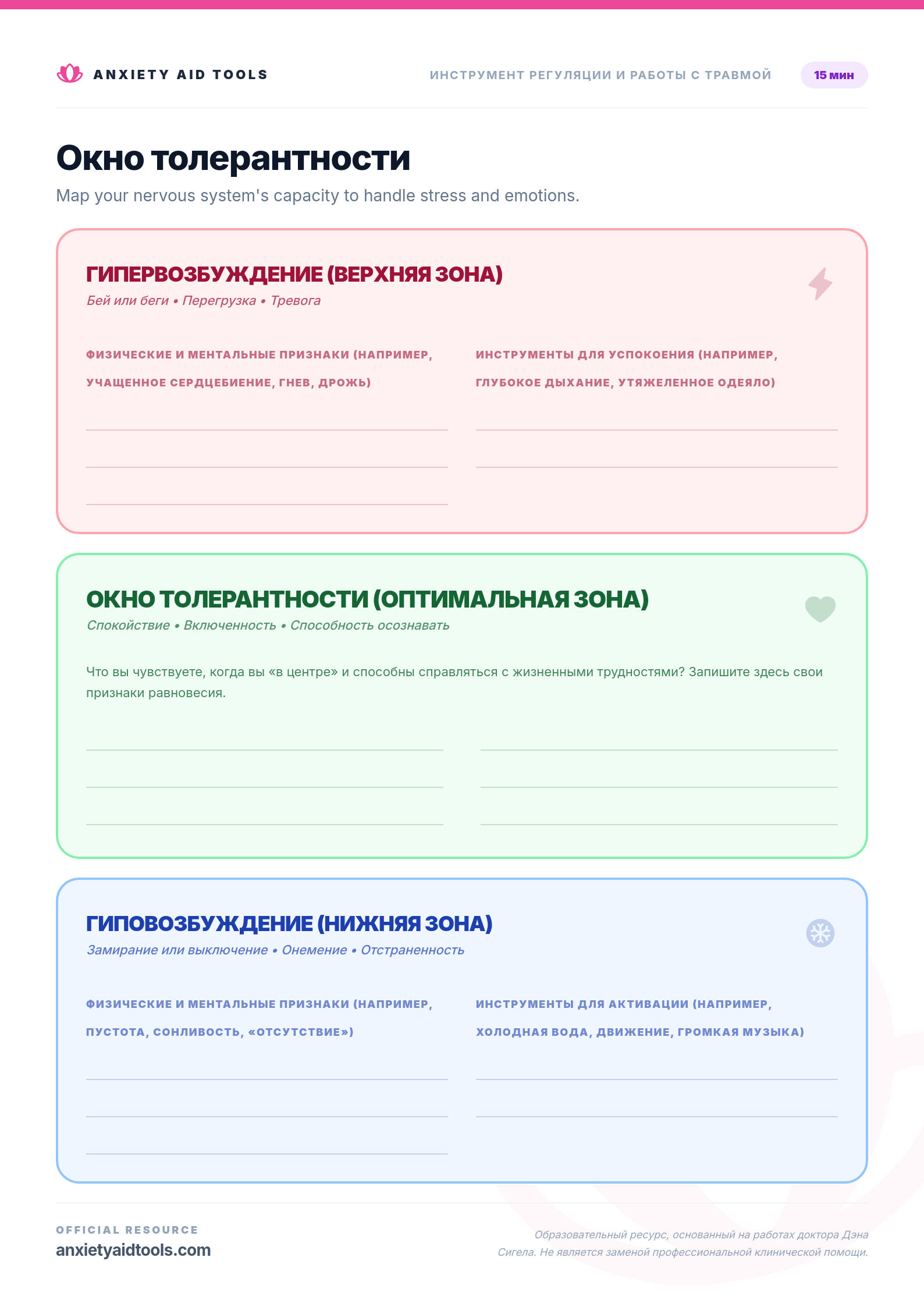 Вне этого окна мы переходим в режимы выживания. Гипервозбуждение — это реакция «бей или беги»: чувство подавленности, тревоги или гнева. Гиповозбуждение — это реакция «замирания»: чувство онемения, отстраненности или истощения. Этот рабочий лист поможет вам составить карту ваших уникальных признаков для каждой зоны.